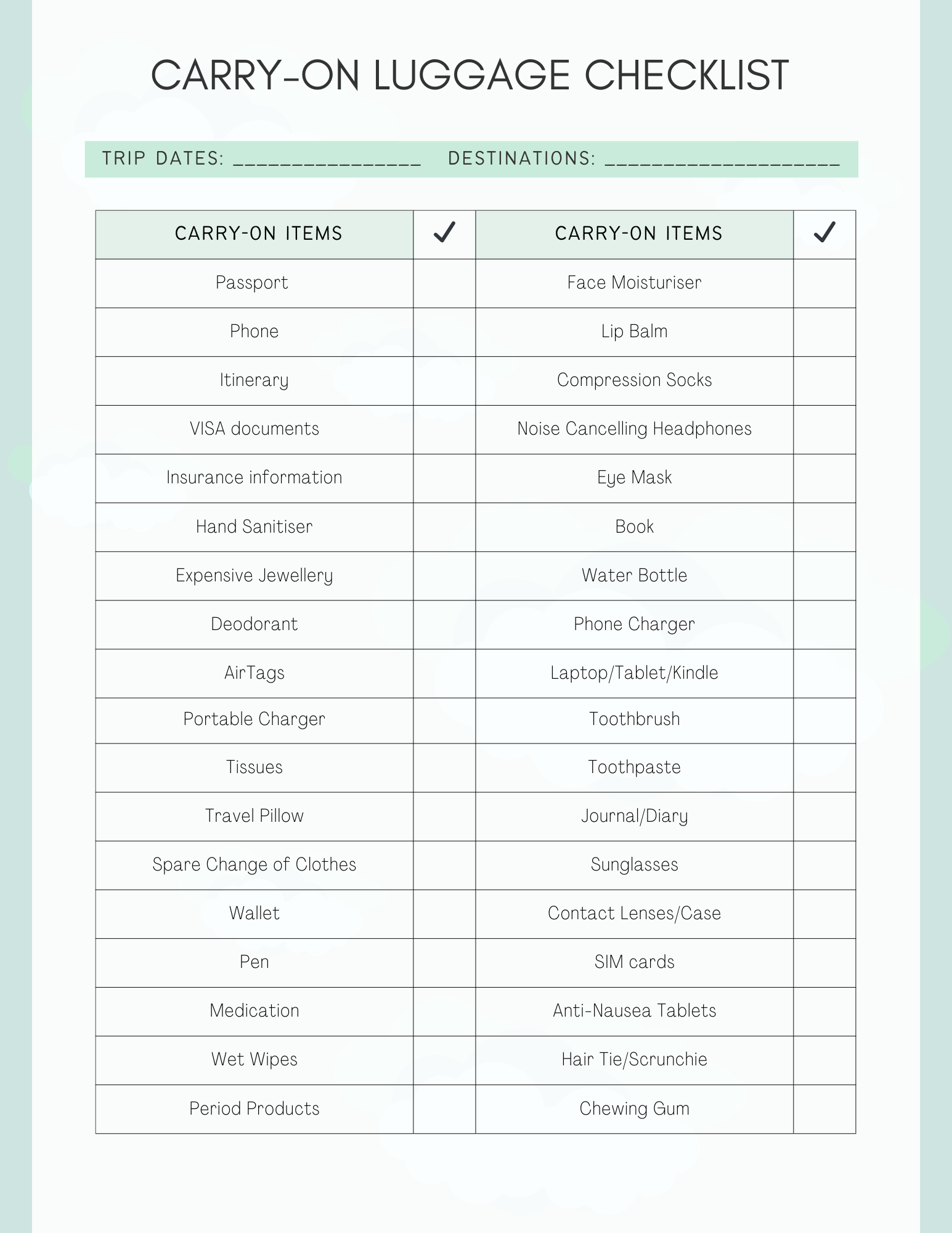 First things first, jot down a list of essentials. Start with the must-haves like clothes, toiletries, travel documents, and any specific items you’ll need for your destination’s climate or activities. Having a list ensures you won’t forget anything crucial and helps you avoid overpacking unnecessary items. I have created a checklist with some of the main items you’ll need:
